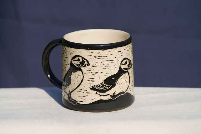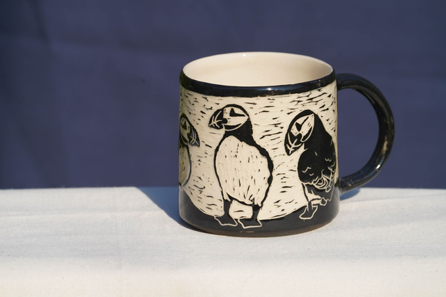 Hand-made sgraffito Atlantic Puffin mug (4 bird design) - bring some seabirds and joy to your hot drinks!